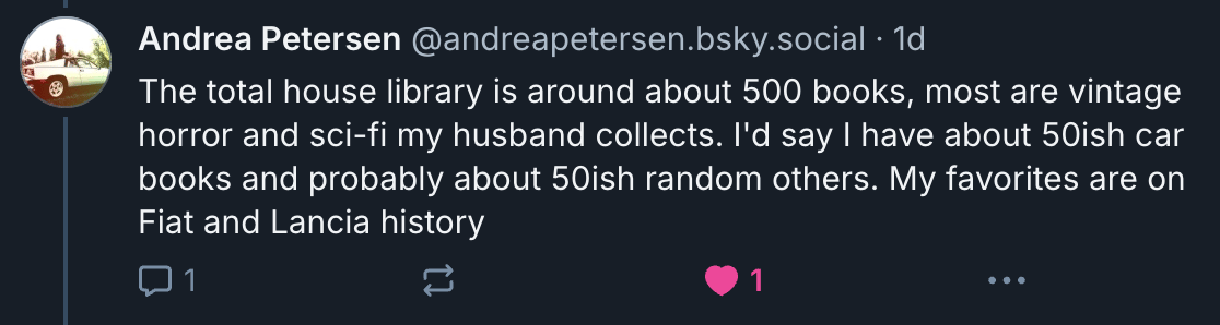 Andrea collects cars (big ones!) and also books. I wish I could collect cars! But I do collect books too (more on that below).